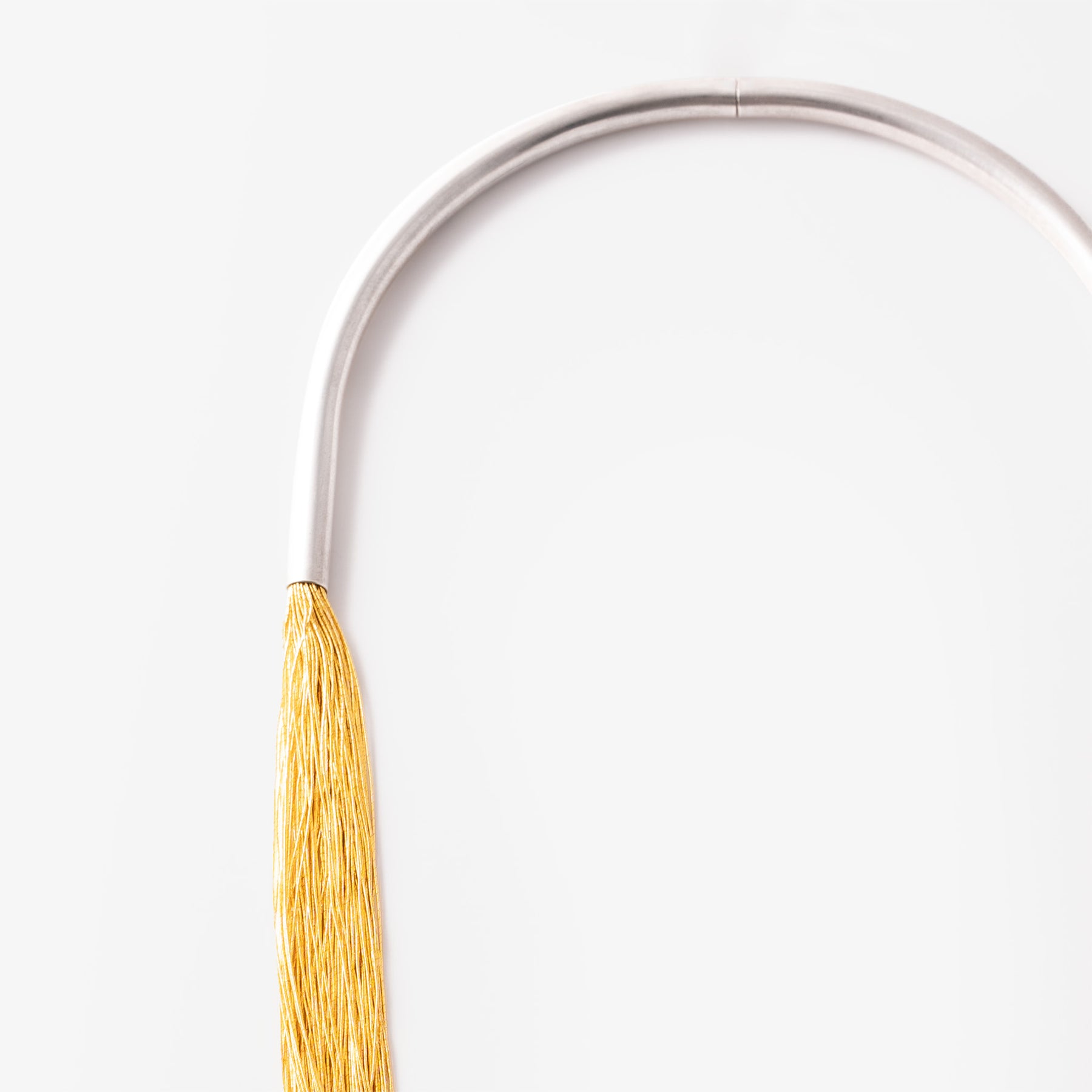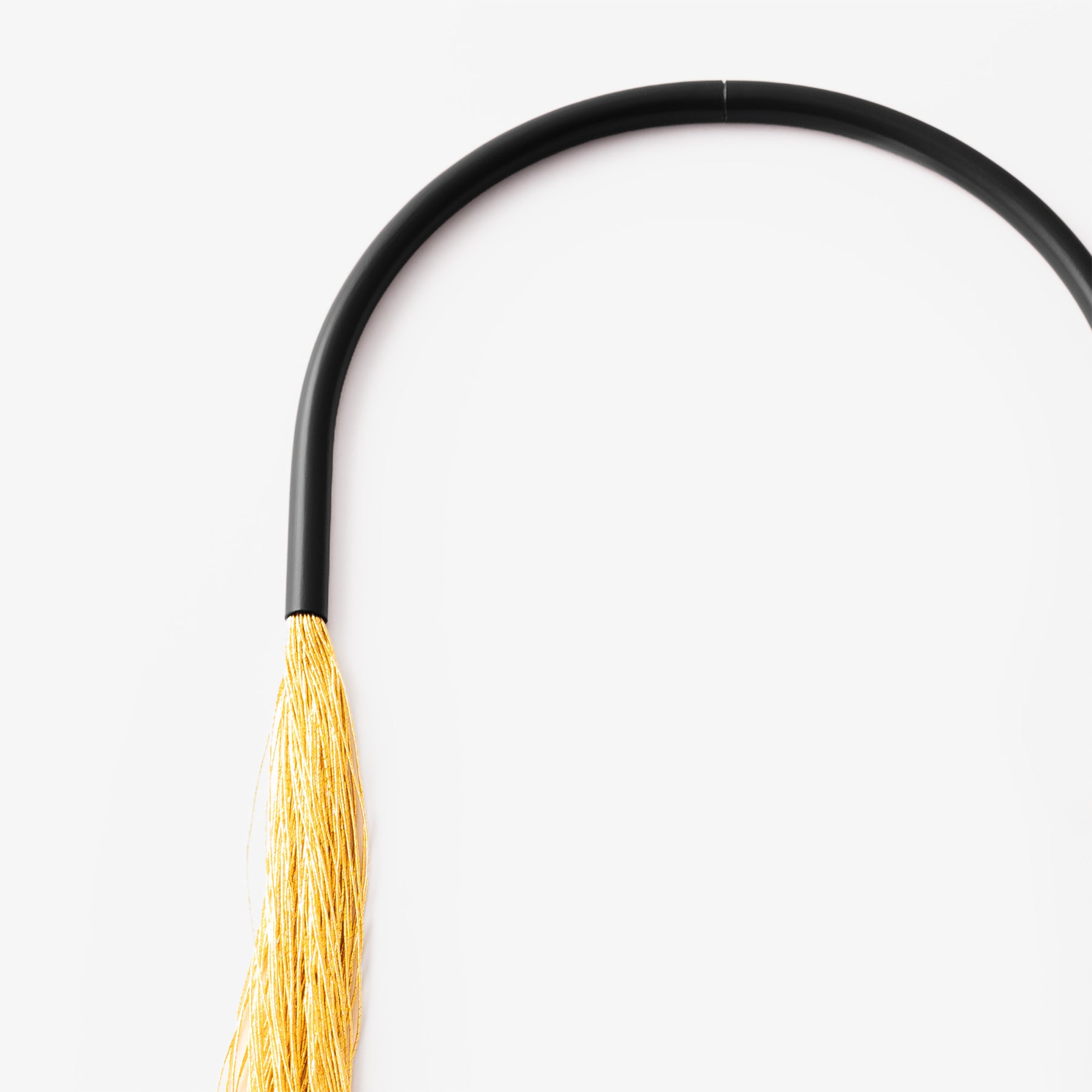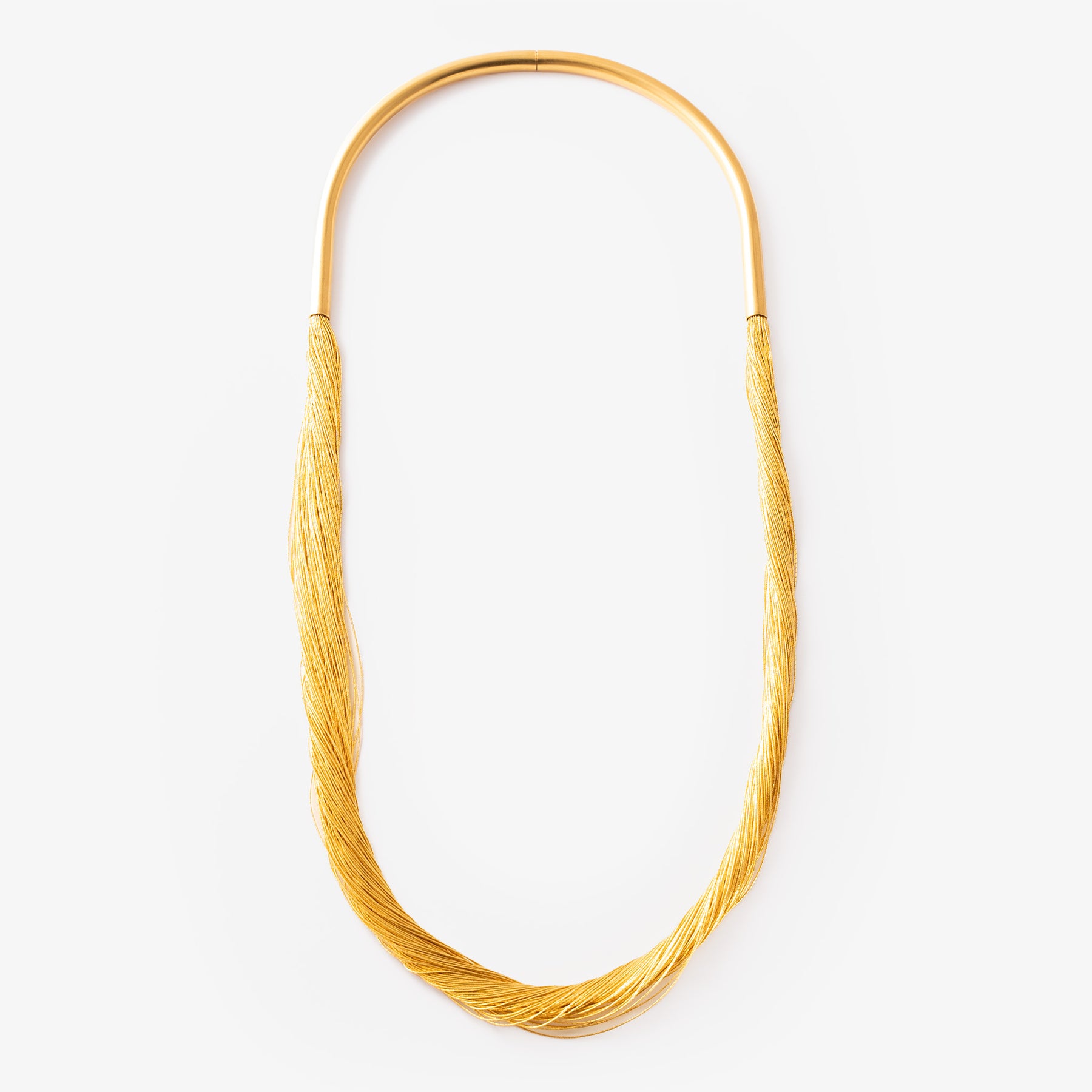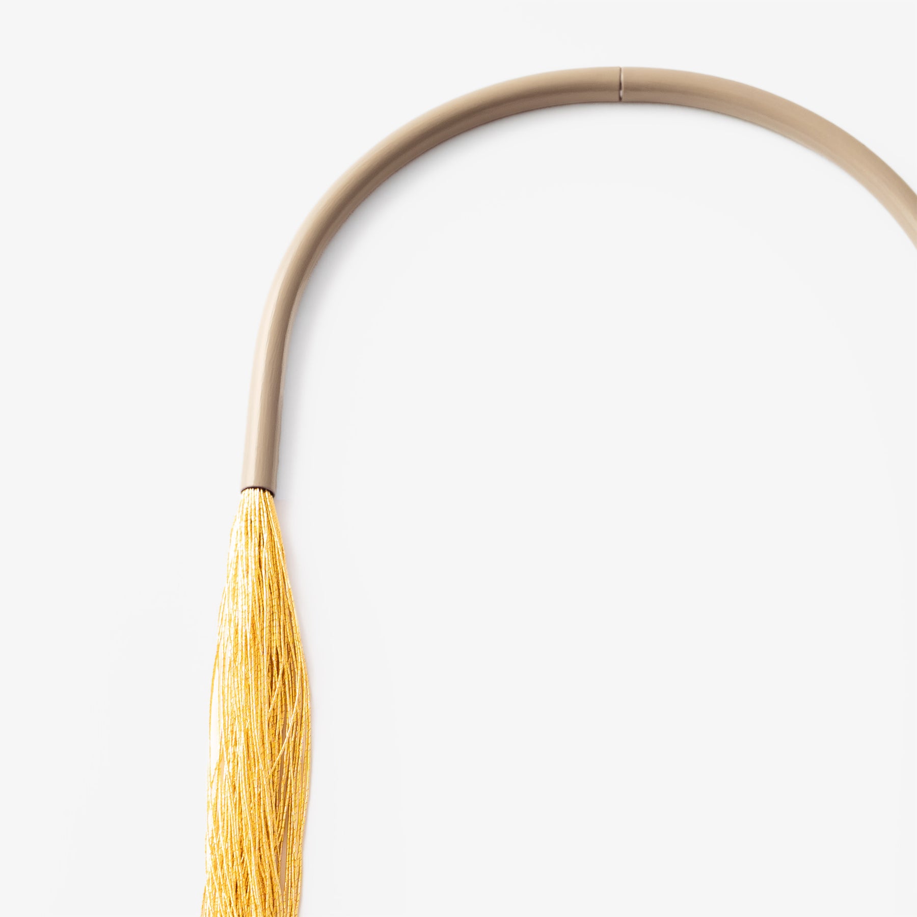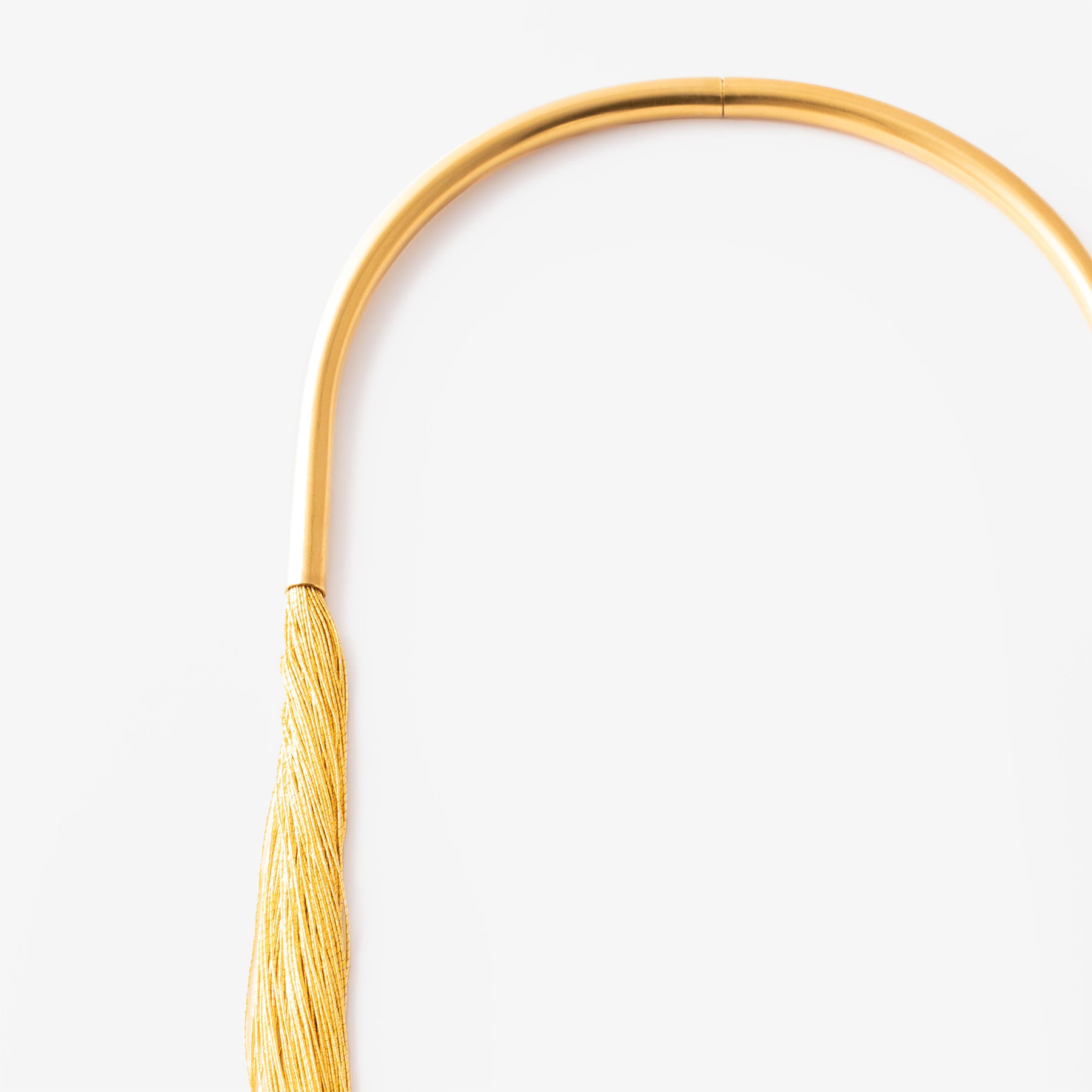京都・紫野の老舗「寺島保太良商店」が手掛ける、純金糸を用いたアクセサリーシリーズ。和紙に金箔を貼った「純金糸」を束ね、美しい艶をまとったアクセサリーに仕上げました。「絲 tabane」は素材そのものの美しさを尊重し、現代の装いにも自然に馴染むようデザインされています。職人の手仕事が感じられる一点ものとして、日常から特別なシーンまで、身につける人の品格を引き立てます